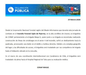 En medio de las labores de combate del incendio forestal en el Cajón de Pejerrey en Linares, un voluntario dela Brigada de Maqui 6 resultó con lesiones