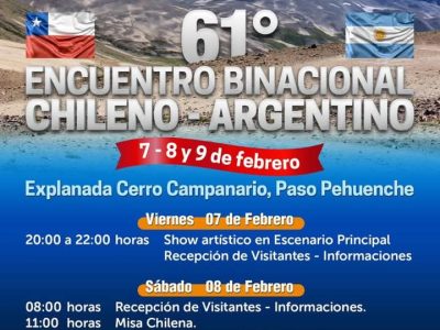Un año más la explanada del cerro Campanario será la anfitriona para efectuar el Encuentro Binacional Chileno Argentino 2025, en su versión 61 La actividad se llevará a cabo el...