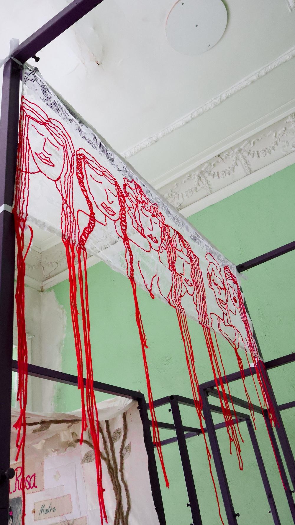 En TEX-TURAS, los textiles son el soporte fundamental de una narrativa de transformación: destejer, cruzar hilos, rotar, arrugar, teñir, pintar, rasgar, coser y bordar son solo algunas de las posibilidades que han trabajado las textileras. Grandes propuestas de tela caen y se entrelazan en el espacio, intervenidos por artesanas textiles que integraron en ellos poemas, relatos de poetas emergentes, imágenes oníricas y realistas, escenas que evocan lo social y lo político.